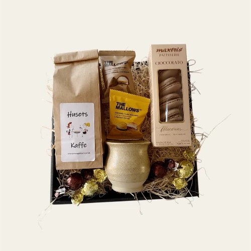 Den ideele forkælelse til kaffeelskeren- fyldt med nøje udvalgte delikatesser og et smukt håndlavet kaffe krus fra Vangs keramik værksted på Fyn, hvilket gør kaffestunden ekstra hyggelig.