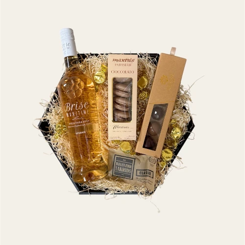 Gavekurv med rosèvin og luksus lækkerier er perfekt til ham eller hende der elsker et godt glas rosèvin og luksus lækkerier.