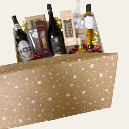 Lækkerierne er pakket i vores flotte julegavekurv, som er sandfarvet og med små hvide stjerner på.