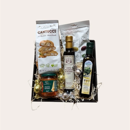Perfekt som gave til livsnydere, værtsgaver eller firmagaver – med klassiske delikatesser som pesto, olivenolie, balsamico og søde italienske cantucci.