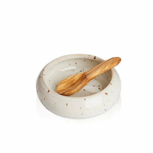 Den rolige glasur har et naturligt og levende udtryk, hvor små variationer opstår i brændingen og gør hvert saltkar unikt. Den medfølgende træske tilfører et varmt, organisk element, der komplementerer keramikken smukt og gør doseringen enkel og præcis.