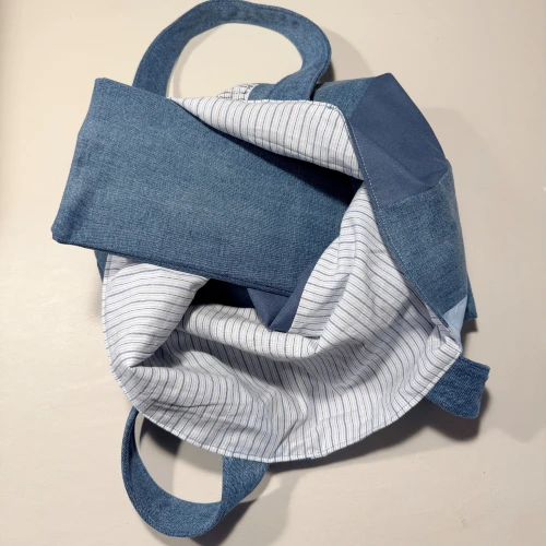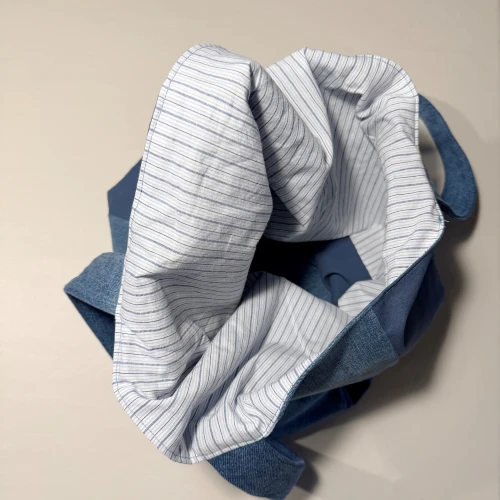 Unik upcycled taske syet af genbrugstekstiler i smukke denimnuancer.